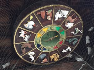 楼門の中央で上を見上げると干支の描かれた丸いものがありました。これは「干支恵方盤」というものだそうで、外側に干支が描かれ内側に方角が書かれています。そして矢印で今の恵方を指し示しているのだそうです。この矢印は毎年大晦日に、新しい恵方を指すように回転されるのだそうですよ。
